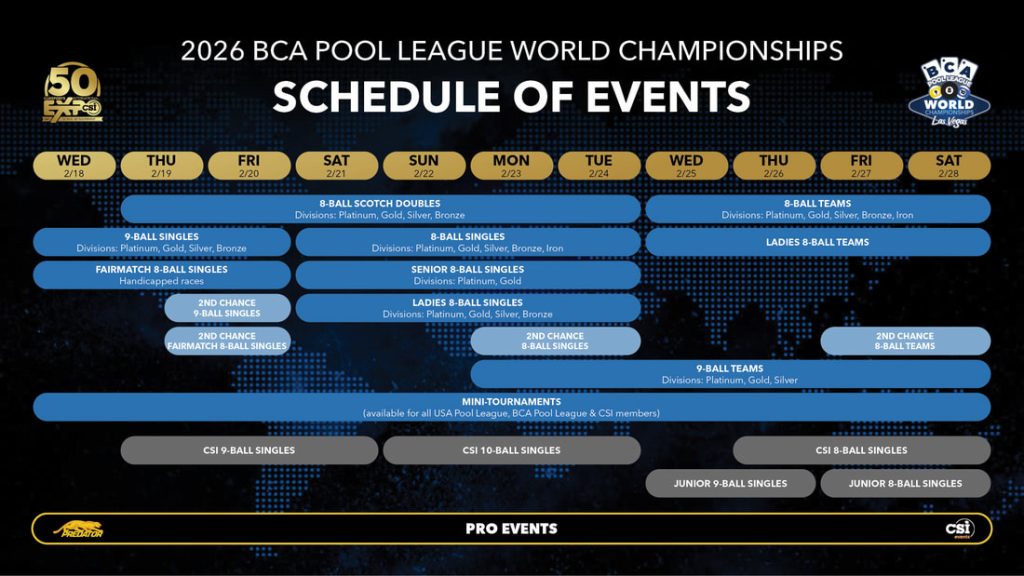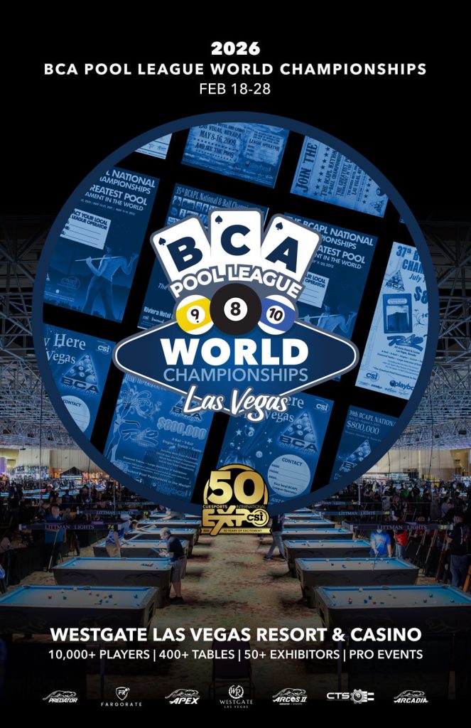 - Both teammates must have had a 2025 BCA Pool League membership and played at least eight (8) weeks in a single division